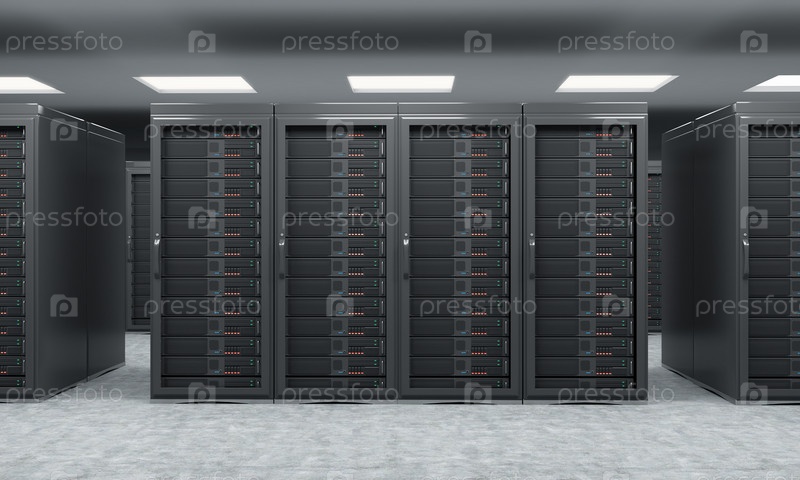 3D-рендеринг сервера для хранения, обработки и анализа данных, ряды работающих машин, вид спереди
