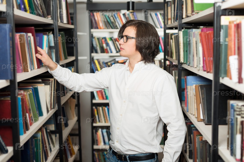 Молодой человек с темными волосами выбирает книгу, стоящую между полками в библиотеке, прикасается к книге, вид сбоку, концепция обучения и выбора