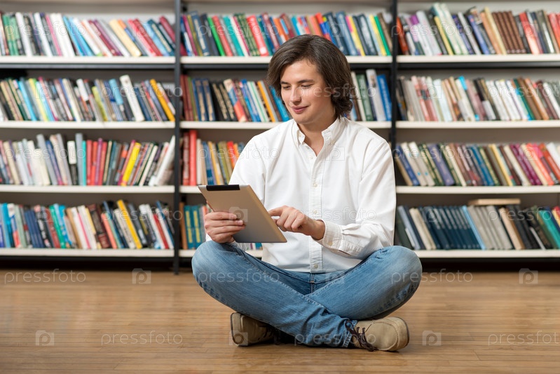 Улыбающийся молодой человек в белой рубашке сидит на полу, сидит со скрещенными ногами в библиотеке с планшетом на коленях, смотрит на экран и прикасается к нему, концепция обучения и исследований