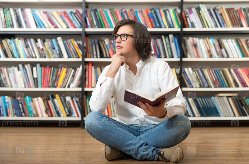 Улыбающийся молодой человек сидит на полу со скрещенными ногами в библиотеке, держит открытую книгу и смотрит в сторону, касаясь подбородка, книжные полки на заднем плане, концепция мышления