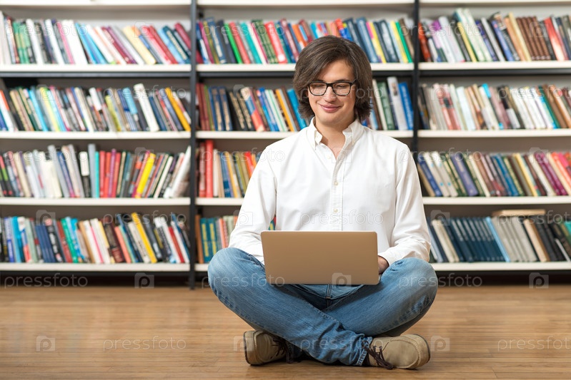 Улыбающийся молодой человек в белой рубашке сидит на полу со скрещенными ногами в библиотеке с ноутбуком на коленях, смотрит на экран, книжные полки на заднем плане, концепция обучения