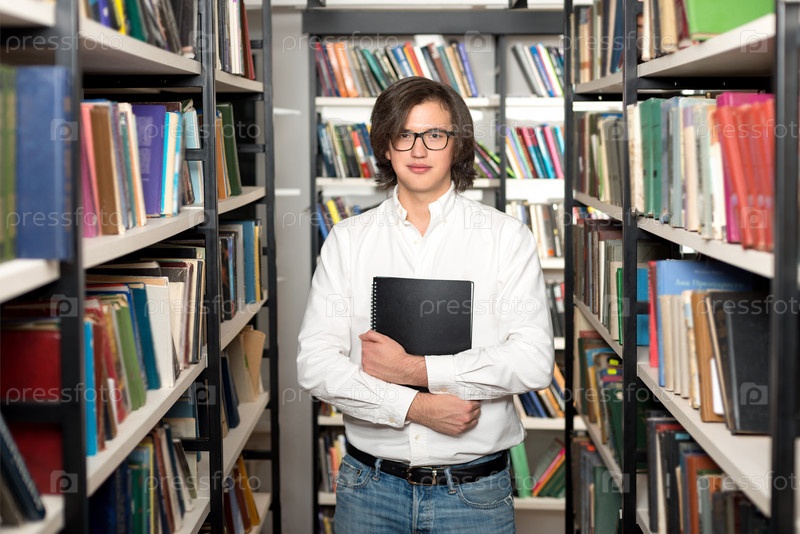 Молодой человек с темными волосами стоит и держит черную тетрадь и блокнот между книжными полками в библиотеке, смотрит перед собой, вид спереди, концепция обучения