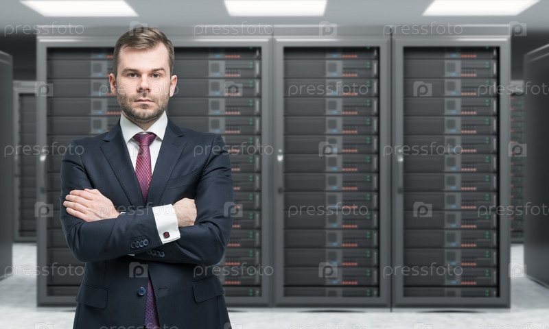 Молодой человек, стоящий со скрещенными руками перед сервером для хранения, обработки и анализа данных, ряды машин на работе, вид спереди, размытый фон