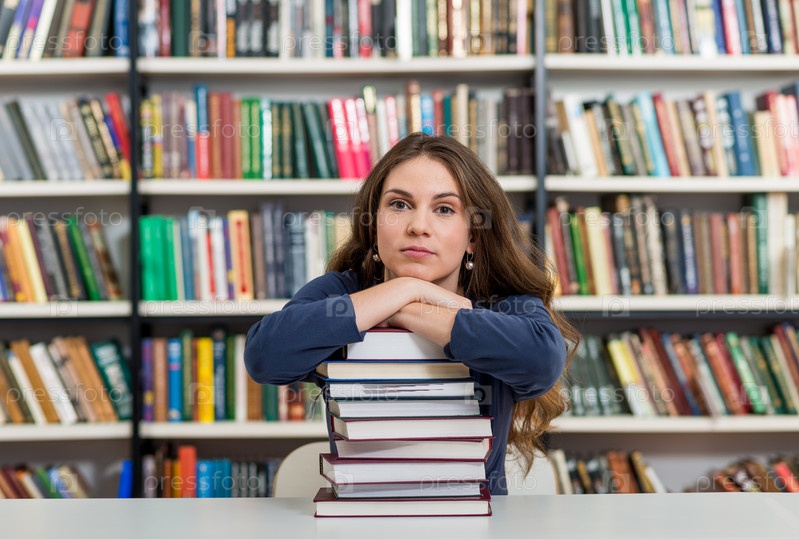 Молодая девушка сидит за столом в библиотеке, положив руки на большую кучу книг и подбородок на них, смотрит перед собой, думает, концепция знаний, размытые книги сзади