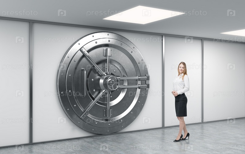 Работница банка, стоящая перед большим запертым круглым металлическим сейфом в банковском депозитарии, концепция безопасности и обслуживания клиентов