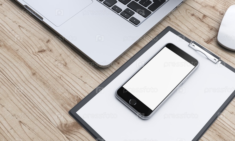 Смартфон на блокноте и клавиатуре, рабочий стол