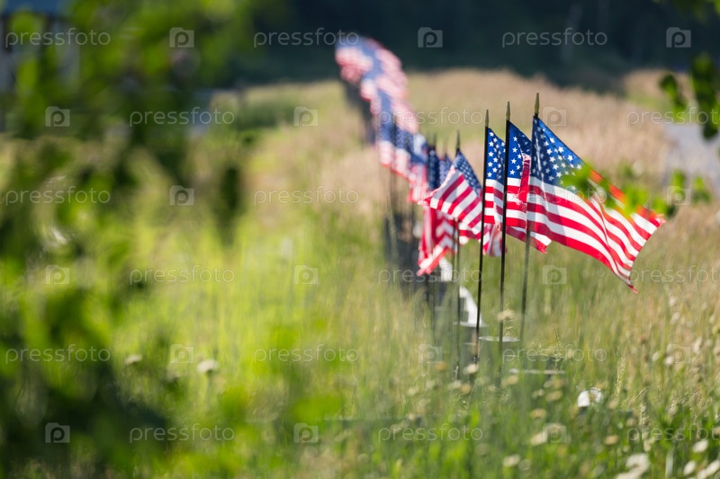 Ряд американских флагов на заборе