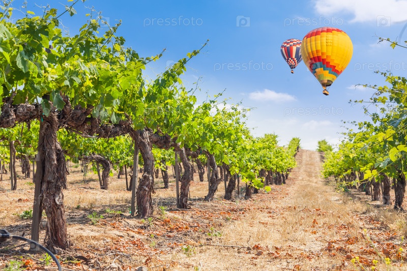 Воздушные шары летают над красивым зеленым виноградником