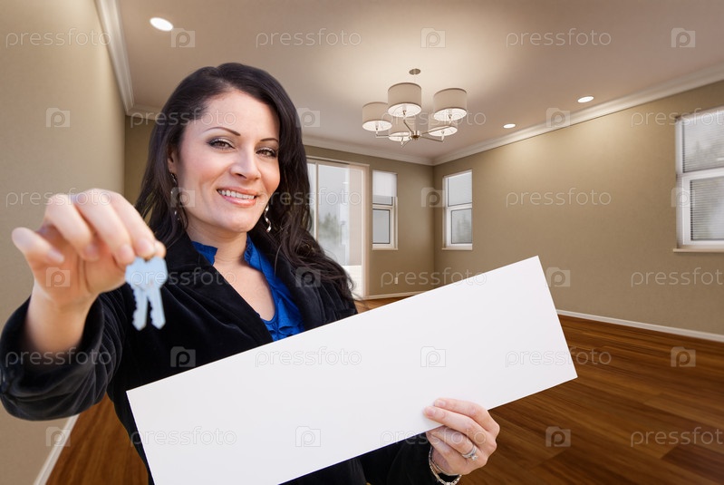 Испаноязычная женщина с ключами от дома и пустым знаком в пустой комнате дома