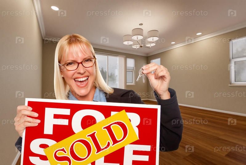 Привлекательная молодая женщина с новыми ключами и проданной недвижимостью в пустой комнате дома