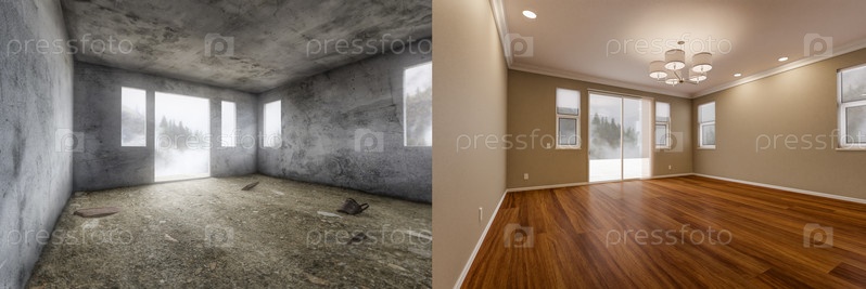 До и после незавершенной необработанной и недавно отремонтированной комнаты дома с готовыми деревянными полами, лепниной, краской и потолочными светильниками