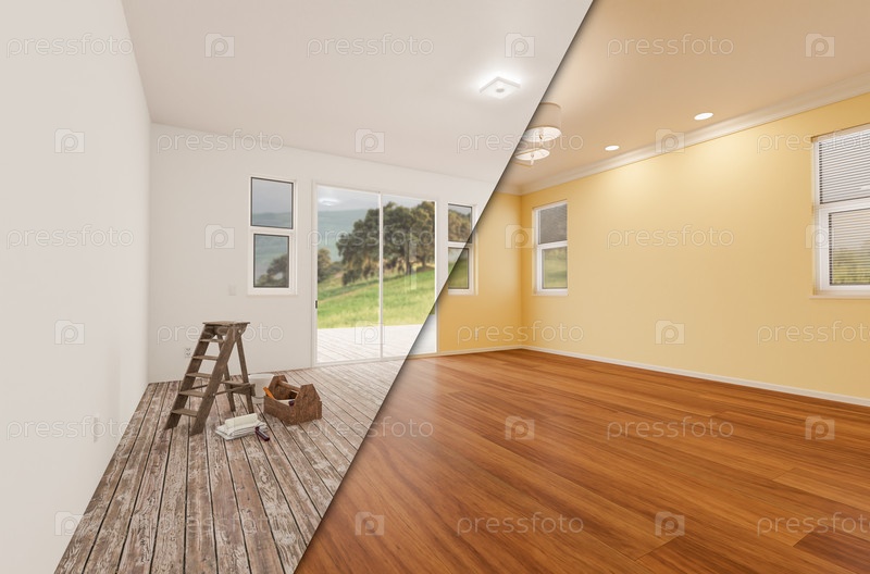 Незавершенная необработанная и недавно отремонтированная комната дома до и после с деревянными полами, лепниной, светло-желтой краской и потолочными светильниками