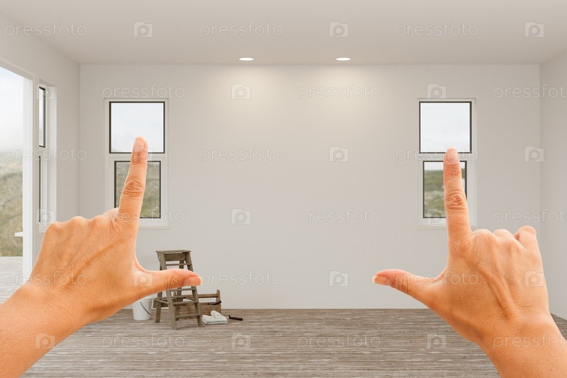 Женские руки обрамляют пустые незавершенные стены в пустой комнате дома