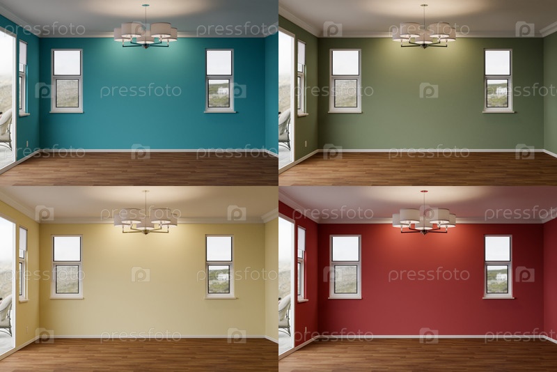 3D-иллюстрация сравнения недавно отремонтированной комнаты в доме с деревянными полами, лепниной, потолочными светильниками и четырьмя разными цветами покрашенных стен