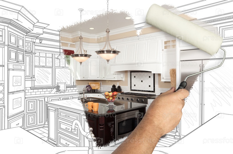До и после того, как человек покрасил валиком, чтобы показать недавно отремонтированную кухню по планам рисования карандашом