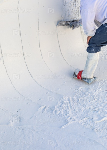 Рабочий в шипованной обуви разглаживает мокрую штукатурку в бассейне мастерком