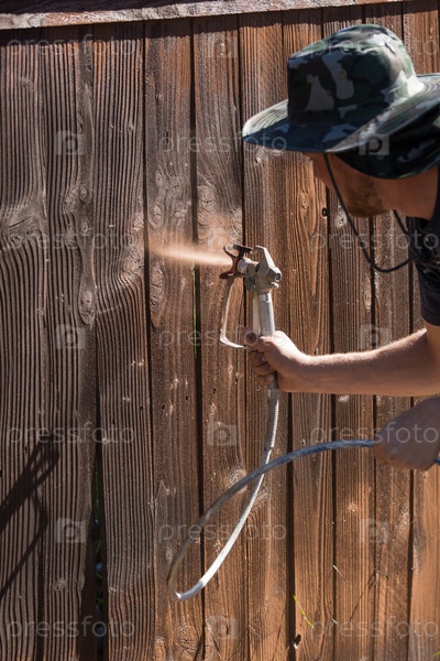 Профессиональный маляр, опрыскивающий забор двора краскопультом