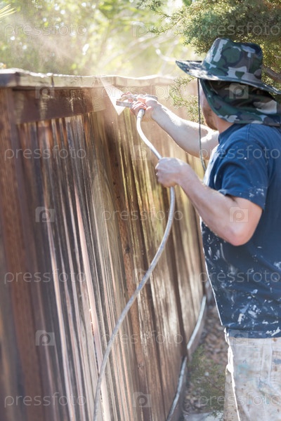 Профессиональный маляр, опрыскивающий забор двора краскопультом