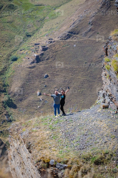Мужчина и девушка в горах смотрят в камеру с распростертыми объятиями