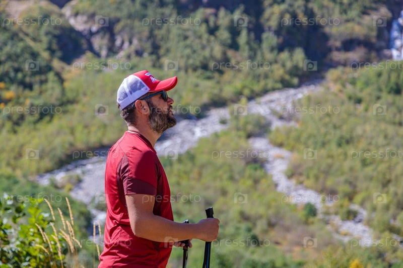 Путешественник с тростями смотрит вдаль по тропинке в горах к водопадам