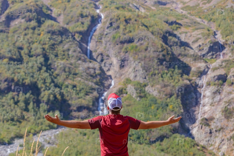 Турист-мужчина радуется поездке в горы, широко раскинув руки