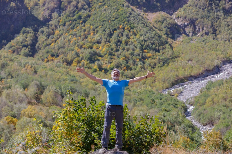 Турист-мужчина радуется поездке в горы, широко раскинув руки
