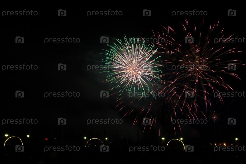 Разноцветный фейерверк в темном небе, празднование дня города