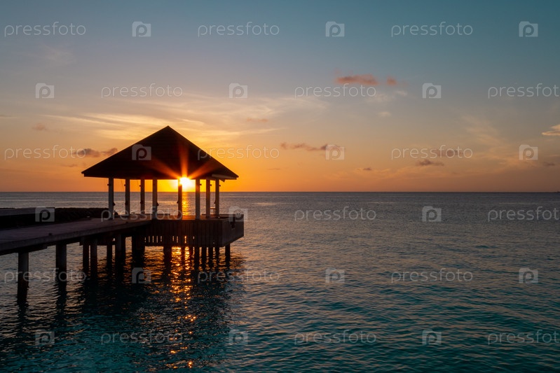 Восходящее романтическое солнце светит сквозь пронзительную хижину на горизонте Индийского океана на курорте Мальдивские острова