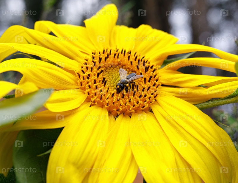 Пчела собирает мед на цветке подсолнуха
