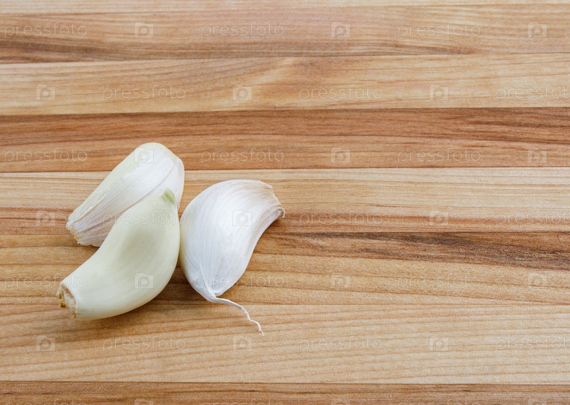 Три кусочка чеснока лежат на деревянной доске