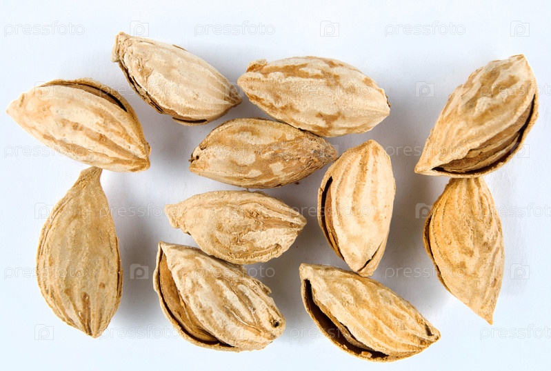 Миндаль в скорлупе на белом фоне