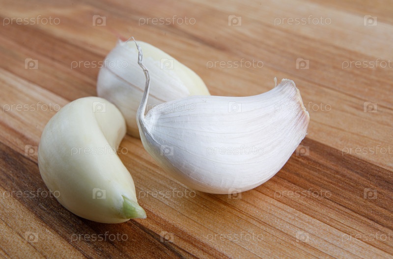 Три кусочка чеснока лежат на деревянной доске