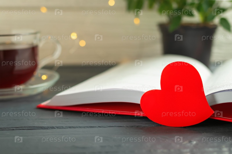 Красное сердце возле открытой книги на фоне размытой чашки чая, зеленого растения и горящих гирлянд. Концепция любви к чтению. Всемирный день книголюбов