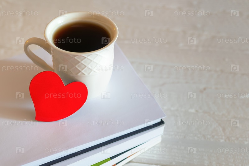 Красное сердце и чашка чая на стопке книг на размытом деревянном белом фоне. Концепция любви к чтению