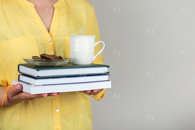 Стопка книг с чашкой чая или кофе и шоколадом в руках женщины в желтой льняной рубашке на сером фоне. Концепция любви к чтению. Всемирный день книголюбов. Копировать пространство