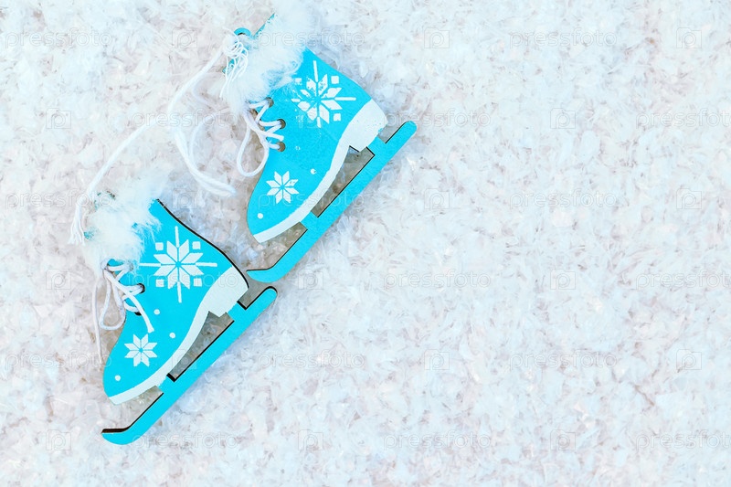 Крупный план игрушечных деревянных коньков на снегу. Концепция зимних видов спорта, фигурное катание на катках, активный отдых. Скопируйте пространство. Плоская укладка