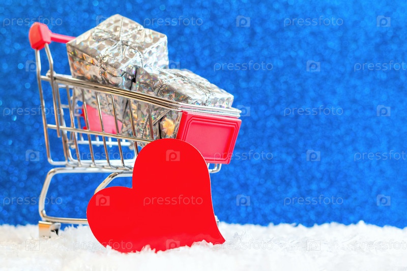 Красное сердце и подарочные коробки в корзине на синем фоне со снегом. Концепция покупки подарков на День святого Валентина