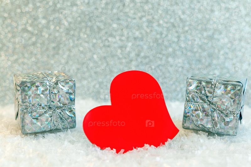 Красное сердце и подарочная коробка на блестящем серебряном фоне со снегом. Концепция сюрпризов на День святого Валентина. Праздничная распродажа