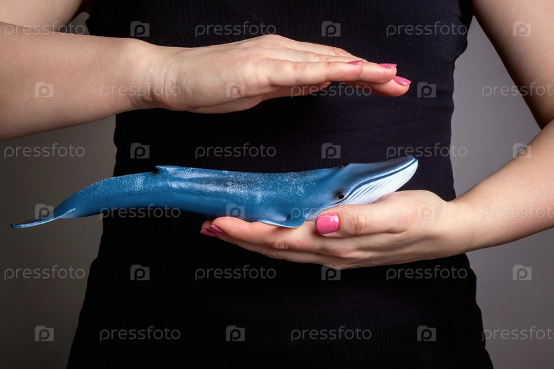 Игрушечный кит в руках женщины в черной одежде. Концепция защиты морских животных. Всемирные дни китов и океанов