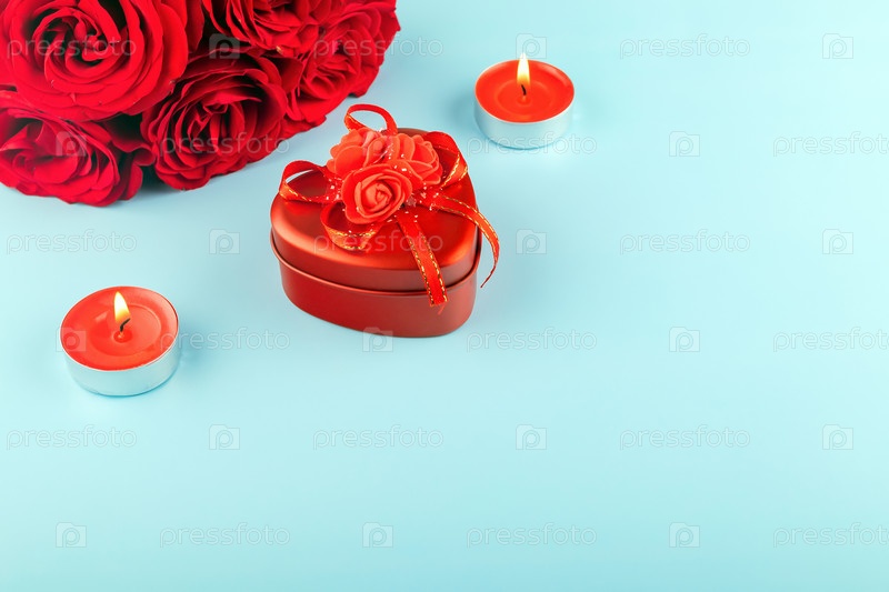 Вид на красную подарочную коробку в форме сердца, зажженные свечи и букет роскошных красных роз на синем фоне. Концепция романтического свидания, День святого Валентина, любовь и подарок. Копировать пространство
