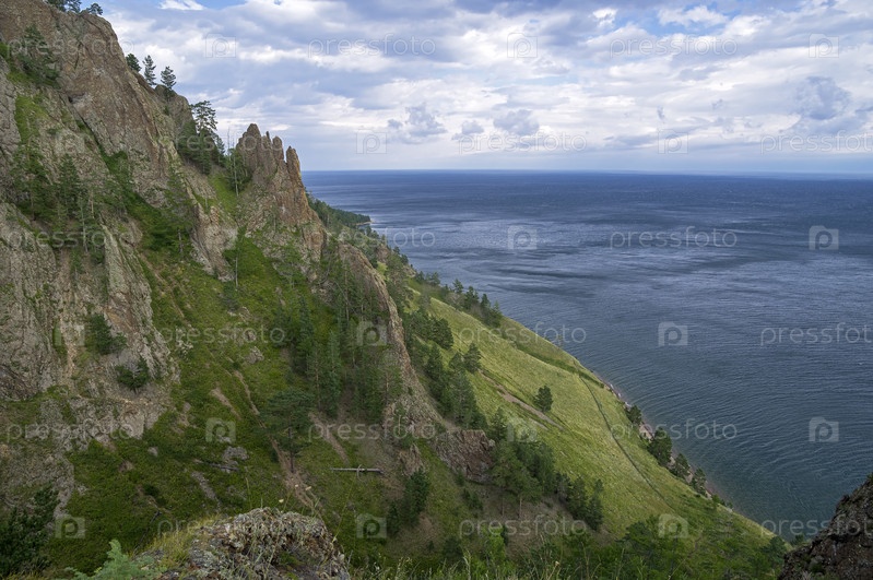 Вид на озеро Байкал со склона утеса Скрипер. Здесь проходит Большая Байкальская Тропа. Прибайкальский национальный парк, Иркутская область. Август