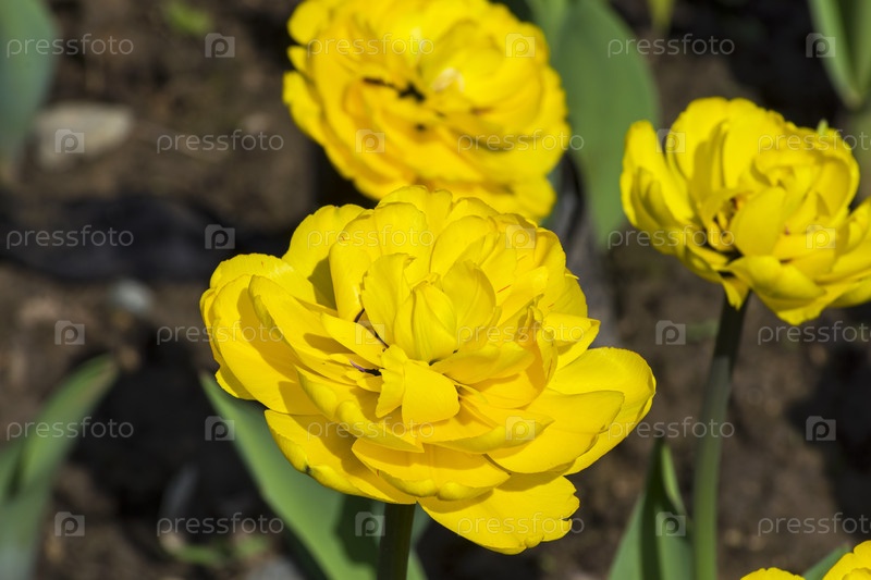 Красивые желтые пионовидные тюльпаны под ярким весенним солнцем. Аптекарский Огород (филиал ботанического сада МГУ), Москва
