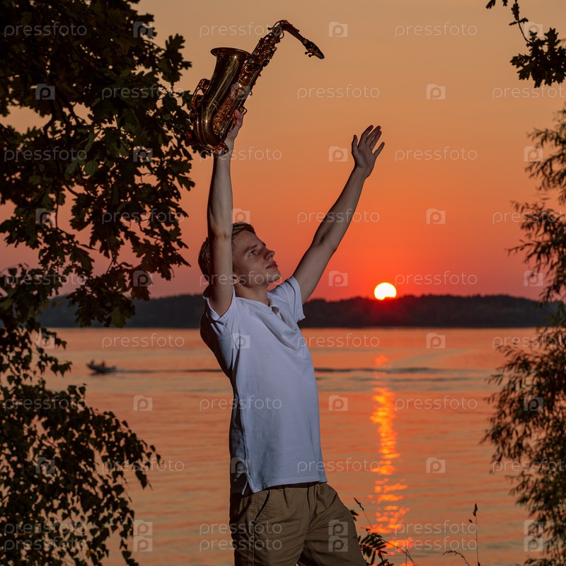 Молодой человек с саксофоном поднял руки вверх, наслаждаясь закатом. Фото высокого качества