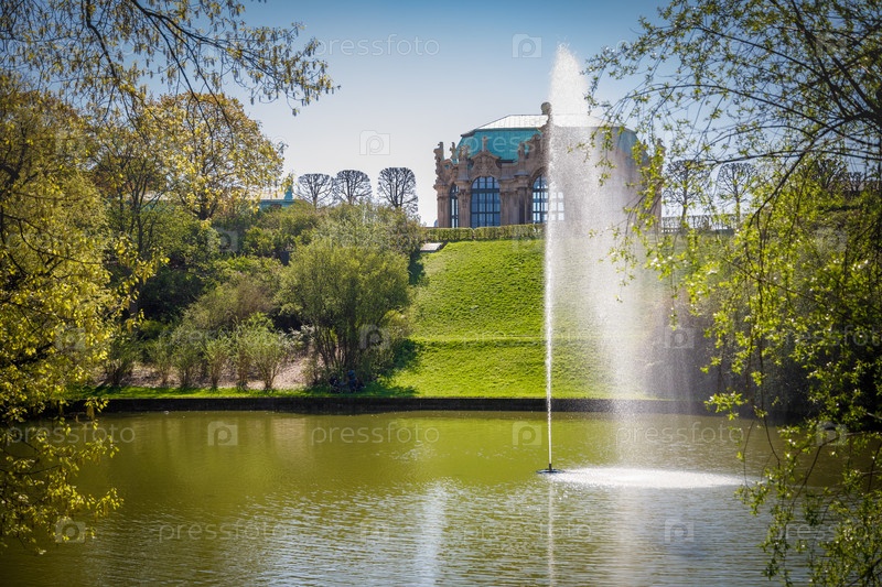 Вертикальный фонтан на пруду в городском парке Дрездена. Фото высокого качества