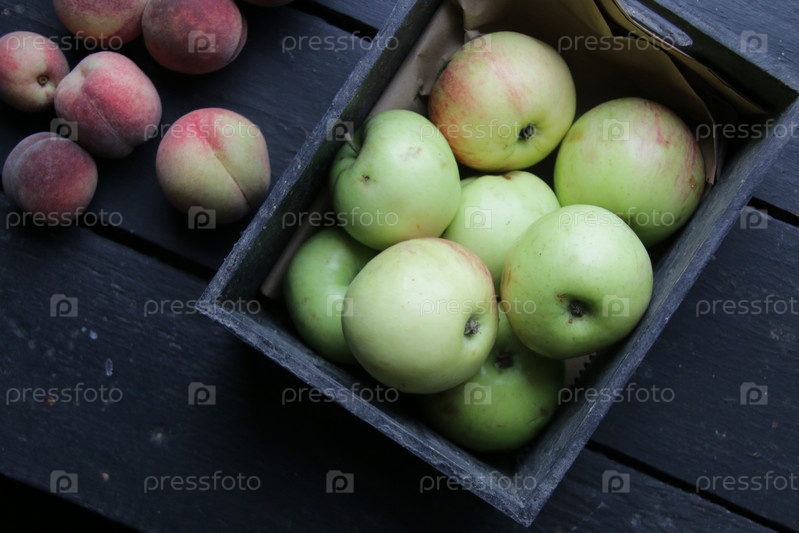 Свежие фрукты. Концепция натурального, здорового питания. Органические фрукты с фермы, собранные в деревянный ящик