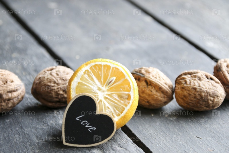 Любовный фон. Сердце с надписью любовь. Лимон и орехи