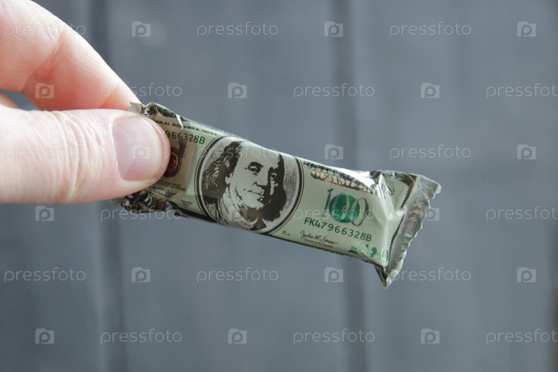 Идея бонуса или приза. Рука держит плитку шоколада в виде долларовой купюры