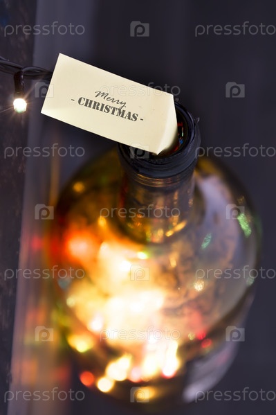 Веселая рождественская открытка - текст и бутылка с цветными огнями