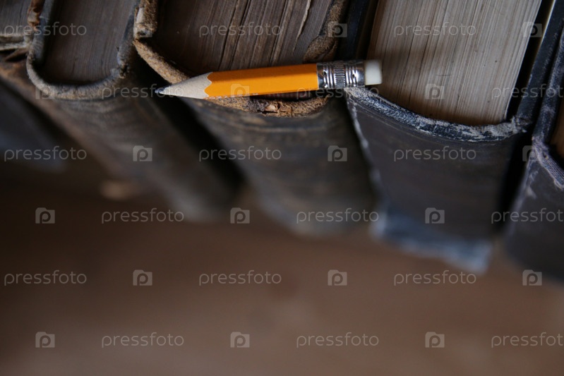 Карандаш лежит на книгах в библиотеке. Вернуться к школьной концепции