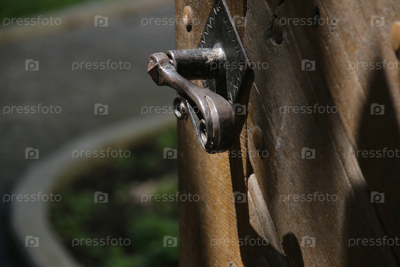 Старая деревянная входная дверь с антикварной ручкой